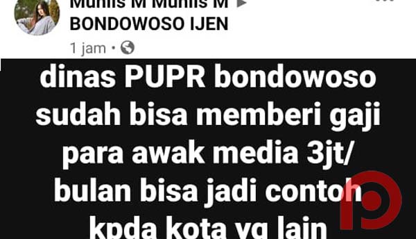 Status Facebook yang diunggahnya itu bertuliskan “Dinas PUPR Bondowoso sudah bisa memberi gaji para awak media, 3juta/bulan. Bisa jadi contoh kepada kota lain”.