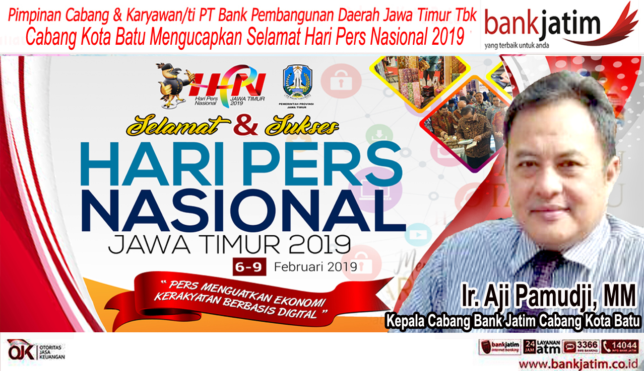 Bank Jatim Cabang Kota Batu Ucapkan HPN 2019 6 Februari 2019 22:01 WIB oleh redaksioleh redaksi Baca JugaBagus Panuntun Dorong Peran Kader PKK, Selaraskan dengan Visi Pemkot MadiunRapat Paripurna DPRD, Bupati Madiun Jawab Tata Kelola Aset dan Layanan Sektor Usaha Daerah Air MinumEkspor IKM Surabaya Tembus 2,73 Juta Dolar AS, SIL Festival 2026 Serap Ribuan Tenaga Kerja LokalLindungi Perempuan dan Anak, Pemkot Surabaya Perketat Layanan Adminduk PascaceraiPerketat Absensi, Mas Dhito Godok Pelaksanaan Kebijakan WFH