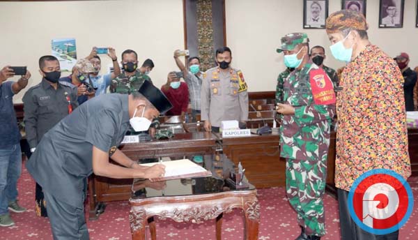 SUMENEP, PETISI.CO – Bertempat di Graha Arya Wiraraja Lantai II Kantor Bupati Sumenep pelaksanaan upacara pembukaan TNI Manunggal Membangun Desa (TMMD) ke-110 Tahun 2021, Bupati Sumenep Ahmad Fausi SH.MH dan Dandim 0827/Sumenep Letkol Inf Nur Cholis.A.Md. tanda tangani berita acara dalam rangka Pembukaan TMMD Ke-110 Kodim 0827/Sumenep.