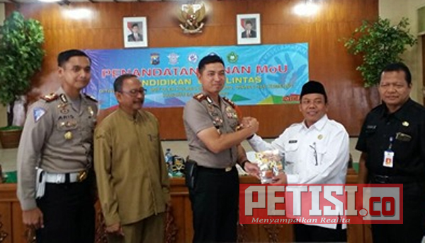 BOJONEGORO, PETISI.CO – Banyaknya kasus kecelakaan yang terjadi di jalan raya dan melibatkan usia pelajar, Polres Bojonegoro mengadakan penandatangan MoU dengan Diknas dan Kemenag Kabupaten Bojonegoro, Selasa (20/02/2018) di Aula Angling Dharma Pemkab Bojonegoro, tentang edukasi lantas sejak usia dini.