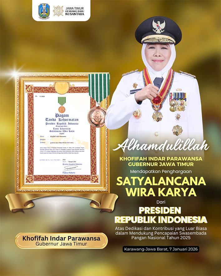 Tanda kehormatan Satyalancana Wira Karya ini diberikan pada Gubernur Khofifah atas dedikasi dan kontribusi luar biasa dalam mendukung pencapaian Swasembada Pangan Nasional sepanjang Tahun 2025.