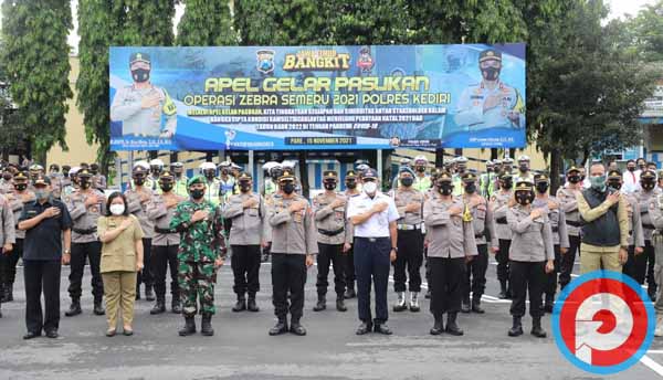 KEDIRI, PETISI.CO – Polres Kediri, Kodim 0809, Satpol PP, dan Dinas Perhubungan Kabupaten Kediri melaksanakan apel pasukan Operasi Zebra Semeru tahun 2021 di halaman Mapolres Kediri, Senin (15/11/2021) pagi.