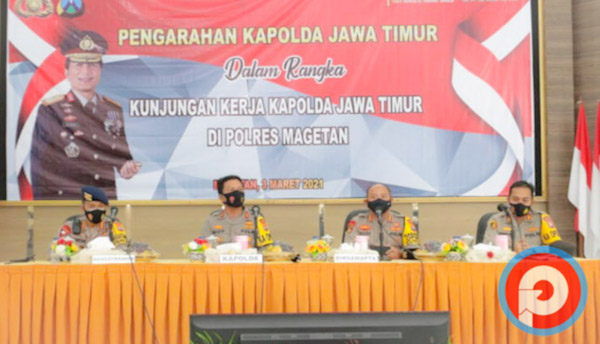 MAGETAN, PETISI.CO – Kapolda Jawa Timur, Irjen Pol Nico Afinta, bersama Pejabat Utama Polda Jatim melaksanakan kunjungan kerja (Kunker) di Polres Magetan Rabu (03/03/2021). Dalam kunker tersebut kapolda memberikan arahan kepada anggota tentang program Kerja Kapolri dan Implementasi Tugas Wewenang dan Tanggung Jawab (TWT), serta penanggulangan Covid-19, di Aula Pesat Gatra, Polres Magetan.