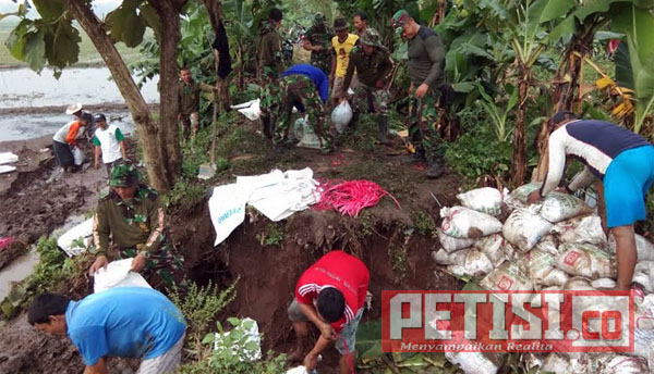 MOJOKERTO, PETISI CO – Personel Koramil 0815/12 Ngoro bersama Kelompok Tani (Poktan) Tani Sidorejo melaksanakan Karya Bhakti perbaikan dan penguatan tanggul irigasi pertanian di Dusun Sidorejo, Desa Wonosari, Kecamatan Ngoro, Kabupaten Mojokerto, Rabu (01/05/2018).