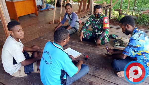 SARMI, PETISI.CO – Personil Satgas TMMD ke-111 Kodim 1712/Sarmi, Kopda Hasarudin, mengisi waktu jelang pembangunan dengan berbincang bersama pemuda Kampung Dorba, Distrik Pantai Timur, Papua, Rabu (2/6/2021).
