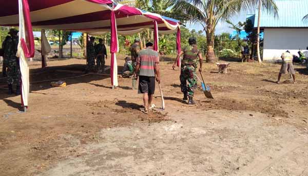 Dimulai dari pembersihan sekitaran lokasi penutupan, hingga pembuatan panggung acara, Satgas TMMD Kodim Sarmi dan warga Kp. Dorba terlihat kompak.