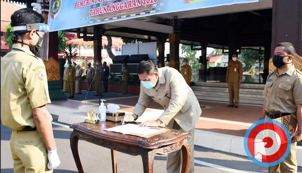 MOJOKERTO, PETISI.CO – Bupati Mojokerto Pungkasiadi, melantik sekaligus mengambil sumpah jabatan 216 orang yang terbagi atas 205 Pegawai Negeri Sipil (PNS) dan 11 Jabatan Fungsional Guru, Senin (29/6/2020) di halaman Kantor Pemerintah Kabupaten Mojokerto. Pelantikan digelar dengan tetap menerapkan protokol kesehatan pencegahan Covid-19 secara ketat.