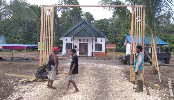 Sarmi, Papua – Anggota Satgas TMMD Kodim 1712/Sarmi bersama masyarakat Kampung Dorba Distrik Pantai Timur melaksanakan pemasangan gapura di jalan masuk Gereja Kp. Dorba, Rabu, (14/7/21)