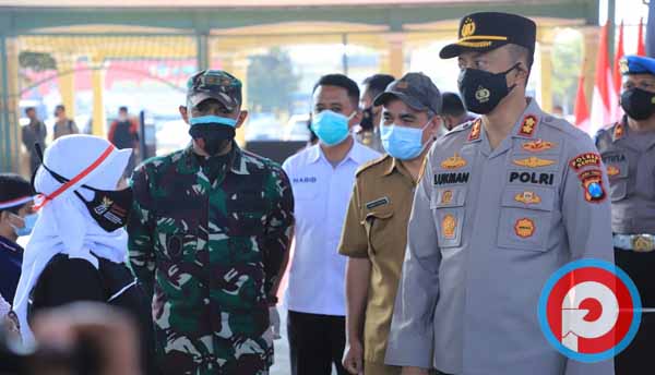 Kapolres Kediri AKBP Lukman Cahyono, didampingi Dandim 0809 Kediri Letkol inf. Ruly Eko Suryawan dan kadis Kesehatan dr.Ahmad Khotib saat tinjau pelaksanaan vaksin