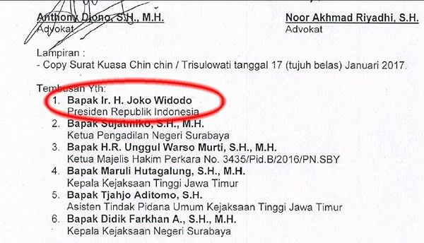 SURABAYA, PETISI.CO – Anthony Djono dan Noor Akhmad, pengacara dari kantor advokat Hotman Paris Hutapea, penasehat hukum Trisulowati alias Chinchin secara resmi mengirimkan surat permohonan perlindungan hukum yang ditujukan kepada Jaksa Agung Muda Pengawas (JAMWAS) Kejagung RI, R Widyo Pramono, Senin (6/2/2017).