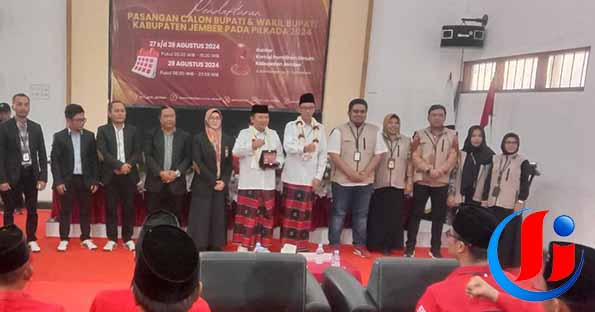 JEMBER, PETISI.CO – Dikawal Dewan Pimpinan Cabang (DPC) PDIP Kabupaten Jember pasangan calon Bupati dan wakil Bupati Jember (2024-2029) Hendy-Firjaun mendaftarkan diri
