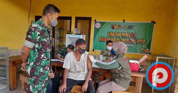 MOJOKERTO, PETISI.CO – Tim vaksin mobile (keliling) Kodim 0815/Mojokerto menggelar kegiatan vaksinasi di Pasar Lespadangan, Desa Terusan, Kecamatan Gedeg, Kabupaten Mojokerto, Jawa