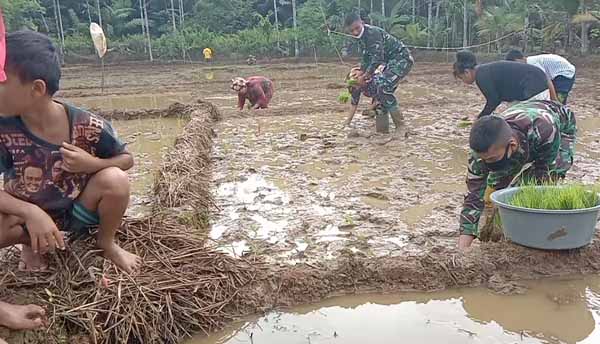 TNI dan Rakyat terlihat sedang tanam padi untuk menunjang ketahanan pangan keluarga mereka dan Desa Siuhom, Kec. Angkola Barat, Kab. Tapsel. (cah)