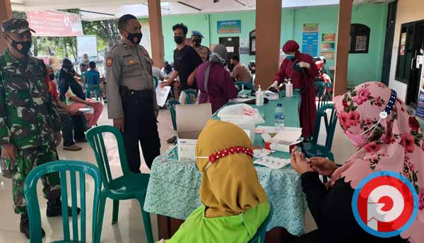 Seperti dilakukan Babinsa Kebonagung Koramil 0815/04 Puri Serda Rismanto bersama Bhabinkamtibmas Brigadir Ahmad Khoiron mengawal jalannya vaksinasi di Balai Desa Kebonagung Kecamatan Puri, Kabupaten Mojokerto, Jawa Timur, Senin (06/09/2021).