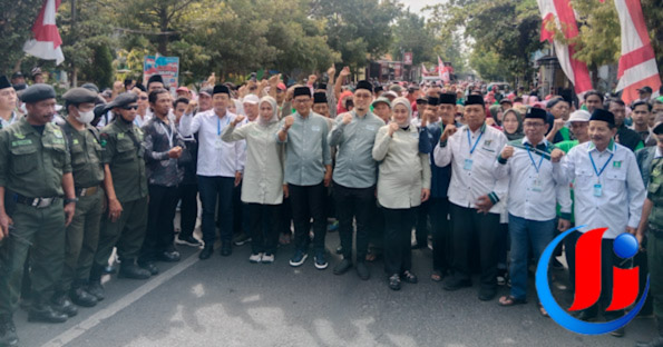 LAMONGAN, PETISI.CO – Ratusan pendukung dan relawan mengantar Abdul Ghofur-Firosya Shalati untuk mendaftarkan diri sebagai pasangan bakal calon Bupati dan wakil Bupati Lamongan pada pilkada serentak tahun 2024 ke KPU Lamongan, tepat di hari kedua pembukaan pendaftaran, Rabu (28/2024).